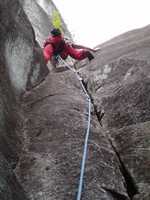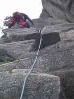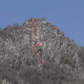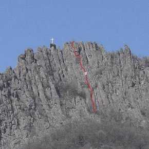 Biramo najvisi deo stene i krecemo pravo gore. Prvi cug soliramo (lagano, ne vise od III+), izlazimo na policu, pravimo stand, jedemo cokoladu i krecemo dalje. Stena... onako... mnogo cistija nego u prethodnom smeru, tako da nismo smeli da se zalimo. Zamisljena varijanta izgleda dosta tesko ali kada covek ima 25 kompleta, 18 frendova, 16 cokova, 13 klinova, 3 skyhook-a i lestvice... nikakav izgovor ne postoji!!! Ja nastavljam dalje kao prvi sa uredno spakovanim braon pantalonama... Biram logican i tezak teren i posle 20-ak minuta izlazim na vrh. Razstezaj dobrim delom previsan ali sa dobrom stenom. Mahovina pisutna. Postavke jako dobre. Straha na pretek! Ocena VI- u dva detalja, ostalo oko IV - V. Abzajlujemo na nekoliko grancica i silazimo do kola gde nas na vratima sacekuje kesa sa sokom, cokoladom i molitvom za putnike.