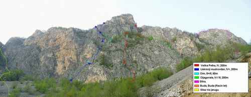 I stvarno, tamo postoji pozamasno platno duzine vise stotina metara, visine do 250. Stena je dosta razbijena, podeljena velikim policama i veoma obrasla, sto je ucinilo da joj je kvalitet generalno los, mada ima lepih kracih deonica. Stena je u celini dosta oborena, ali je u stvari puna kratkih vertikalnih ili cak blago previsnih skokica koji izlaze na obrasle police. Hvatovi su uglavnom puni zemlje it rave, ali ima i cistih. Svi standovi su na velikom drvecu, a i medjuosiguranja su uglavnom na nekom rastinju. Od opreme sam uglavnom koristio klinove, jer su pukotine za ostalo ili zapunjene ili je stena vrlo razbijena. Pristup od puta do stene je kracim siparom do 40º jedno 15 min. Silaz abzaljom ili velikom jarugom levo od platna.