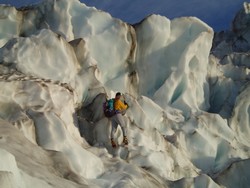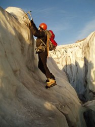 Daleko na gleceru vidimo vidimo grupu penjaca ali nikako nam nije jasno kako su uspeli sa morene da predu na glecer.Posle nekoliko sati lutanja po gleceru najzad nadosmo put do seraka za penjenje, kako je kasna letnja sezona led je poput betona, provodimo ceo dan penjajuci po seracima, novi cepin I bajla su definitivno bolji od mog starog alata I nadam se da cu ih intezivno koristiti sledece sezone, naravno ne mogu a da se ne setim svojih privih uspona u ledu pocetkom osamdesetih I opreme koja se tada koristila.Stizemo pre mraka do satora I vidimo da se na zapadu iznad Pacifika skupljaju tamni crni oblaci, zatezemo sator sto se tokom noci pokazalo kao vrlo dobra odluka jer je vetar tako duvao da nam se na trenutke cinilo da ce da nas oduva zajdno sa satorom.Jutro sivo I maglovito, pokusavamo da spakujemo sator pre nego sto pocne kisa.