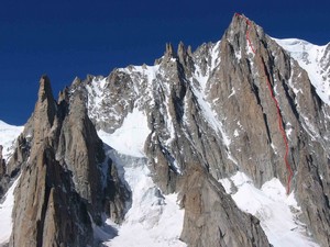 U trecem cugu (V+) Igor penje kao drugi slobodno s rancem na ledjima i “umire“ do standa. Donosimo odluku da se povucemo nakon 120m penjanja jer je bilo podne i videli smo da tako ne mozemo popeti smer nikada. Pogresili smo u taktici s zimarenjem i jednim teskim rancem. Odlucujemo da odmorimo u dolini i sacekamo novi lep dan da pokusamo uspon u „fast and light“ varijanti. Inace vec u prva 3 cuga smo uvideli da je smer sjajna. Silazimo u Chamonix.