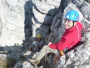 Penjem u navezi sa Korneom, redak primerak učesnika programa koji nije iz „alpskih“ zemalja, pa sa njim nalazim lakšu žicu za komunikaciju... Greben ima pružanje I-Z, pa tako da u momentima kad smo na južnoj strani uživamo u blagodetima sunca i suve stene, međutim kako zađemo na severnu stranu, moje cipele reaguju na mokar sneg, koga kako napredujemo, ima sve više... Ipak, nemam često priliku da penjem takav greben, i po danu kakav smo imali, sunčan, bez vetra, bez oblačka, ubrzo i sa bojama zalazećeg sunca, nisam više razmišljala o mokrim nogama, nego sam se prepustila uživanju penjanju u fantastičnom žutom granitu!
