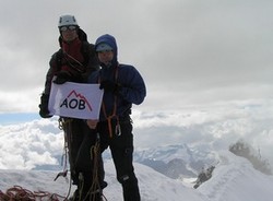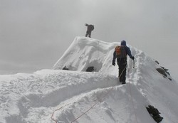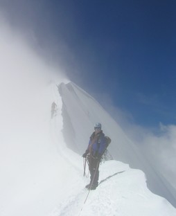 Dalje nastavljamo po steni koja je nesto kvalitetnija i teza gde se na vecim partijama nalaze brodska uzad. Uskoro srecemo naveze koje se vracaju sa vrha sto na standovima stvara guzvu. Oko 14h dolazimo do prepoznatljivog Ramena ( 4250m ) odakle sledi snezna padina nagiba oko 50stepeni.