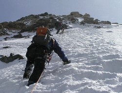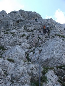 Smer krece odmah iza doma i prvo sto srecete je brodsko uze pomocu koga savladjujete plocu visine par metara i tezine, rekao bih 4+ ( UIAA ) - lepo Boga mi. Uspon Severo-Istocnim grebenom je inace ocenjen kao AD sto predstavlja kompleksnu ocenu koja ukljucuje penjanje suve srtene tezine 3 sa povremenim detaljima 4 ( UIAA ) i snega/leda nagiba do 55stepeni.