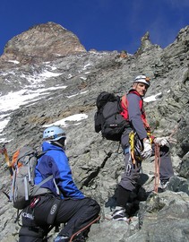 Stena je, slobodno bih rekao krs, kako se ono ne srusi ni sam ne znam. Polako se priblizavamo Solvay Hute-u ( bivak skoloniste na 4003m ) i primecujemo da je stena nesto teza - sada su to konstantno tezine 3 ( UIAA ) a tezi detalji su obezbedjeni fiksnim uzadima tako da smo nesto sporiji jer vise ne mozemo
