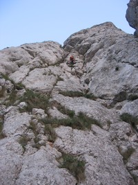 Prvi deo uspona je po suvoj steni, ide se grebenom i povremeno se traverzira po Istocnoj padini radi obilazenja raznih tornjeva i sl. prepreka i moze se reci da se tada penje stena tezine 2 ( UIAA) sa povremenim detaljima tezine 3 ali je zapravo najveci problem u tom delu snalazenje u steni - nalazenje pravog puta.