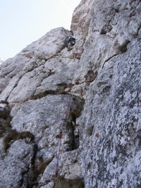Marka kacimo prusikom za obliznji zbun, ja vodim pocevsi smer od mesta u steni gde je upisana brojka 7. Od podnozja postoje odprilike tri pukotine koje se spajaju u kamin. Krecem tom levom pukotinom, stavljam usput 3 coka i jedan frend kao medjuosiguranja. Onda posle zatravljene police u toj levoj pukotini dolazi nezgdan detalj. Nemam gde da stavim medjuosiguranje. Vidim klin jos jedno metar i po gore. Od prethodnog medjuosiguranja sam vec popeo oko 2m i ako ispadnem usput ima da "sidjem" jedno 5-6 metara, a to mi se bas ne dopada.