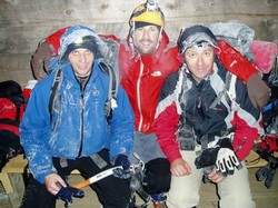 E sada kreće najgori deo, kao i obično što biva... Mi bi odmah da krenemo, a oni bi ljudi malo da danu dušom, što je i normalno, jel. Ali...oni su vidno izmoreni moraju da ˝danu˝ malo duže, pojedu nešto, popiju... ajd i to je OK, ipak nama trojci je sve hladnije i sve smo nervozniji i nestrpljiviji da krenemo dole, jer ta staza nije ni malo naivna, vidljivost je 10-tak metara, uskoro će mrak, ceo dan smo napolju na minusu, umorni smo, gladni. Mislim da sam naveo sve stavke iz knjige pod ˝kako najebati˝. Konačno krećemo dole. Shvatam da Pera jedva nabada korak po korak, a Borisovo stanje je još gore! Čak mu se povremeno muti u glavi. Milina! Fića je na vrhu, pokušavajući da piša (pronađe mališu :-) skinuo rukavice i smrzli su mu se prsti tokom te radnje i sada mu je sve hladnije. Meni je hladno na nožnim prstima, ali od sve muke ta mi je došla najmanja. Jedino se Dren za sada ne žali ninašta, ali je vrlo svestan u kakvom smo stanju (sranju). Jedva naziremo put, tražimo levo desno. Dren je na začelju uz Borisa, pomaže mu pri svakom koraku. Ipak smo na okupu i vidimo se koliko toliko.