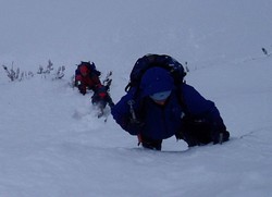 Završio se greben, na širokom smo sedlu, nema nikakvih tragova dalje, ipak znamo gde od prilike treba ići, tražimo. Od jednom Fića je nestao! Sada je bio iza mene i više ga nema?! Gledamo se u čudu da bi zatim primetili procep u snegu i Fićinu zaprepašćenu facu u njemu 1,5m niže. Sva sreća nije se povredio! Da je samo uganuo članak ne želim ni da komentarišem šta bi sve moglo da se desi. Sigurno je da bi ovaj izveštaj ja kucao nosom a ne prstima u najboljem slučaju... Elem, jedna strana pukotine je led, druga stena i dosta je usko. U jednom trenutku sam pomislio –blago njemu, dole ne duva!- Dodao mi je ranac i nekako kaminski se iskobeljao gore. Našli smo i nastavak staze.