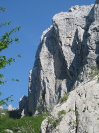 24.4. Poslednjeg dana našeg boravka u Paklenici, odlučujemo da se vratimo u veliku stenu i popenmo Velebitaški smer (350m, 6a+). U smer ulazimo u 9h ujutru, stena je u hladu i prilično je hladna, a najteži detalj je i dalje mokar. Velebitaški smer čini „pakleničku triologiju“ zajedno sa smerima Mosoraški i Klin. Kao takav, smer je vrlo popularan i valja biti na ulazu ranije, inače je gužva. Smer smo popeli bez većih problema za 5h. Uspeli smo da se „otvorimo“ na rukama jer je stena bila hladna i mestimično veoma oštra. Sam najteži detalj je prečka nogama po ploči i rukama po horizontalnoj tankoj mokroj pukotini i izlazak preko trbuha u zajedu. Da nije bila mokra pukotina, verovatno bismo se više potrošili u smeru jer bismo se hvatali za nju sve snage. Ovako smo morali malo da uključimo mozgove i prečku izvedemo nogama po ploči pridržavajući se samo malo rukama. Nakon najtežeg cuga težina opada, a smer se zavlači pod sam Brid Klina što je jedinstveni prizor. Na vrhu Anića Kuka nas je obasjalo Sunce po prvi put. U dolini smo sreli Slovence koje smo upoznali 3 dana ranije u Debelom Kuku kad smo penjali Dijagonalku (6a+), a oni Senza Piata (6b+). Sada su oni penjali Dijagonalku i nisu se baš usrećili. Kažu da je znatno teža od Senza Piata, a oni su imali i nekoliko padova. Preporučili su nam da penjemo Senza Piata koju je napravio Italijan Paolo Pezzolato kojeg bije glas da su mu ocene precenjene. Slovenci rekoše samo: „Ako ste popeli Dijagonalku, ovo vam je perje.“ I poslušaćemo Slovence, ali sledećeg puta kad dodjemo u Paklenicu.