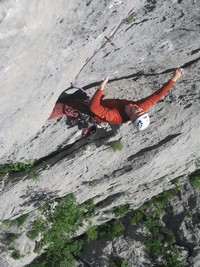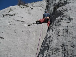 Nakon nečeg što je izgledalo kao čitava večnost jedva smo dočekali "skini me!", pa sam se ja navezao i ubrzo krenuo. Ulaz je bio prilično težak (Beka je čak jednom ispala na ulazu!), posle toga malo lakši deo, a onda sam došao do prve prepreke - okapine. Tu sam se prilično pomučio. Ovi mi je bio prvi put da penjem u trojnoj navezi, pa mi je dosta smetalo Bekino uže (Beka je pela paralelno). Nekako bi mi se uvek nalazilo na putu baš kad sam u najtežim detaljima, pa bih pored mučenja da popnem morao još da preskačem njeno uže, provlačim se ispod njega i sl.