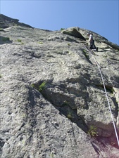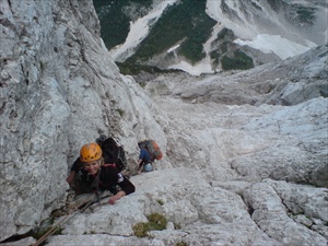 Munjevita akcija, polazak iz Beograda autom u ranim jutarnjim časovima po promenljivom vremenu da bi tokom dana stigli u kišoviti Martuljak gde uzimamao ključ i krećemo u bivak pod Špikom koji je na oko 1400m.n.v. Sutradan osvanjuje sunčan i lep dan kako je već prognozirano i mi smo u 8h na početku smera. Prvih 400m do Dibonovih polica je lakši teren koji ne prelazi tezinu III i koji penjemo solo da bi se zatim preobuli, navezali i krenuli kao trojna naveza. Rastežaji su sve ozbiljniji, nailazimo na klinove, stena je dosta krušljiva, a ključne težine su u gornjem delu gde su 4-5 vezanih rastežaja težine između V-, V+ . Na vrhu smo u 17h posle koga sledi jako naporan silazak od 1600m.n.v. po siparu i strmoj planinarskoj stazi a u Beograd stižemo tokom noći oko 3h pošto smo se svi izređali za volanom.