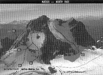 Nikola i Jazz na vrhu Mt.Matiera 2770m. Costal Mt. Canada prvi Yugoslovenski uspon na vrh smerom Severozapadni steber kombinacija led/stena ocena uspona 2-3, 45 - 50 stepeni visini smera 900m. Fotografija pokazuje smer uspona broj 64 na slici, prvobitan plan je bio uspon severnom stenom broj 63 na slici ali su rubne pukotine na glečeru bili velike tako da smo se opredelili za kombinovano penjanje po severozapadnom steberu.