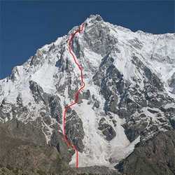 Nanga Parbat-ova moćna Rupal stena. Sa svojih 4000 metara (13.000 fita), to je naveća alpska stena na svetu. Za usporedbu, vršna piramida je veličine od skoro dve “El Capiten” stene. Obleležena je linija smera i mesta bivaka.